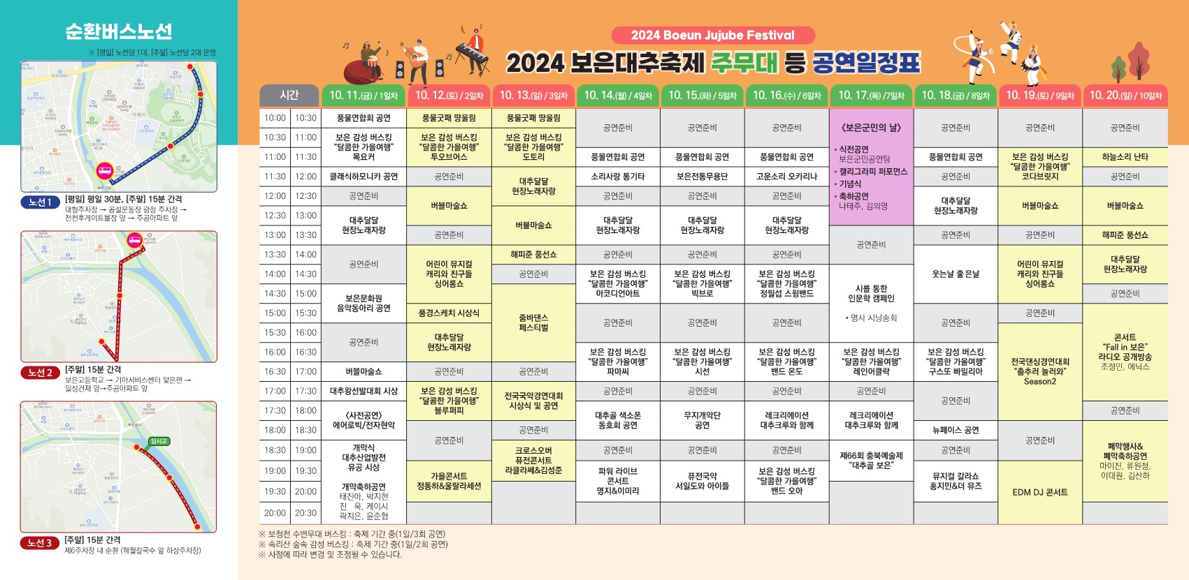 2024 보은대추축제가 10. 11.(금) ~ 10. 20.(일)까지 보은읍 뱃들공원 및 속리산 일원에서 개최됩니다.